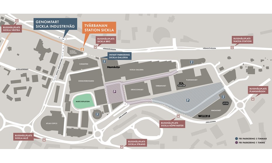 Vill du åka bil till Sickla Köpkvarter? Från den 14 december går det återigen att svänga av från Värmdövägen in på Sickla industriväg, som öppnas upp för genomfart. Från Sickla industriväg är det smidigt att svänga in och parkera i vårt p hus ovan Sickla galleria där du står gratis i 3 timmar. För du vet väl att du parkerar gratis i 3 timmar på majoriteten av våra parkeringar? Läs mer om parkering i Sickla här.